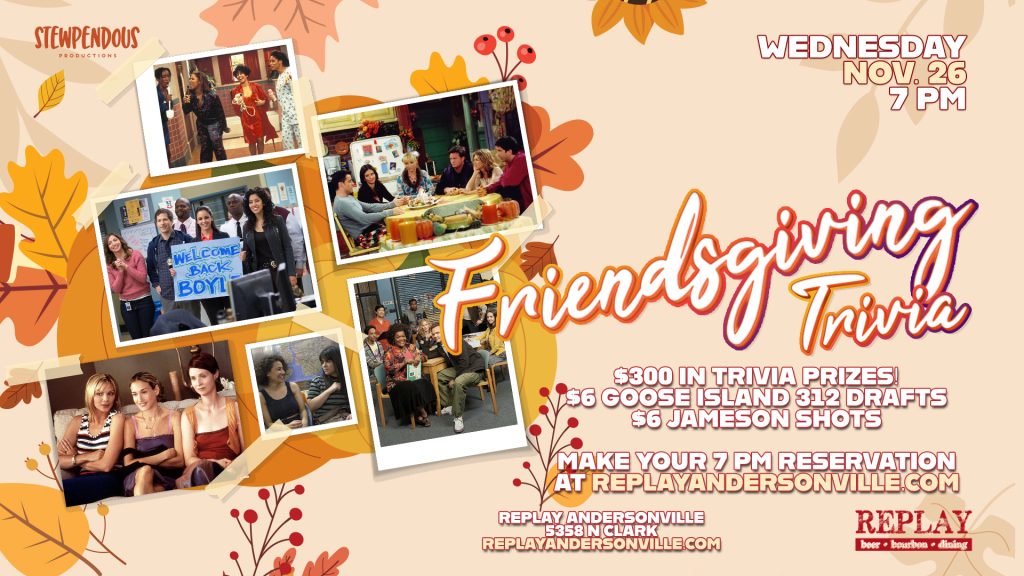 Gather your crew and bring the group-chat energy to Friendsgiving Trivia at Replay Andersonville! 🦃✨ We’re celebrating TV’s most iconic friend groups with a night of laughs, nostalgia, and $300 in trivia prizes.