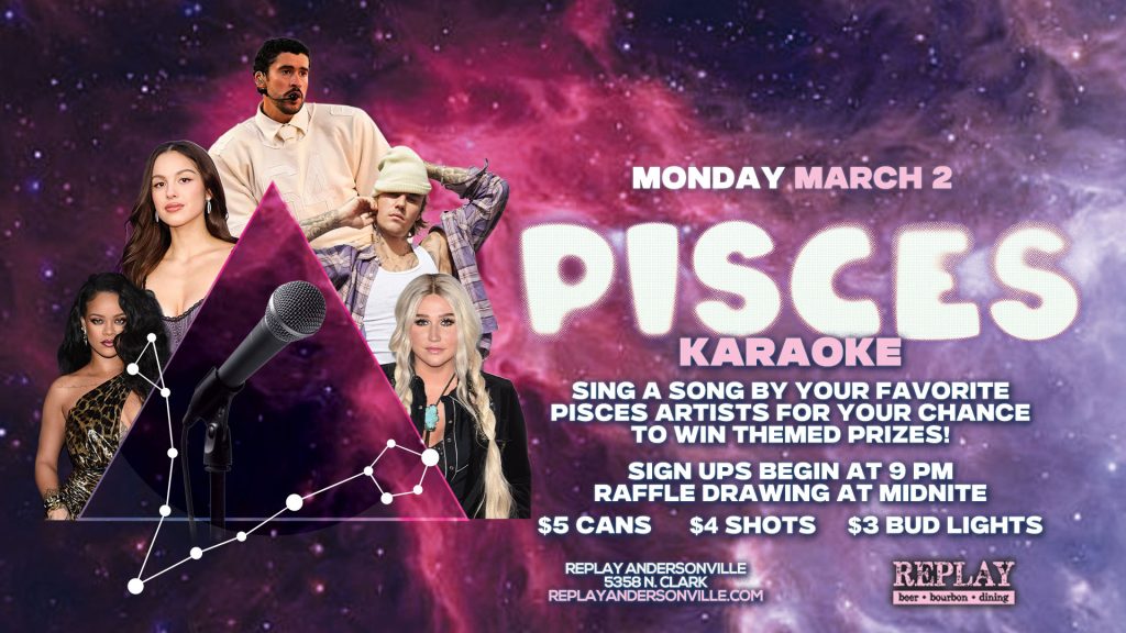 Pisces season, grab the mic! We’re diving into the feels with Pisces Karaoke. Sing your favorite Pisces artists (like Bad Bunny, Rihanna, or Justin Bieber) and compete for themed prizes all night long.