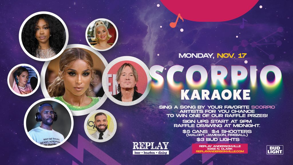 Join us Monday, November 17 for Scorpio Karaoke! Sing a song by your favorite Scorpio artist (think Drake, Ciara, SZA, Katy Perry, and more) for your chance to win one of our raffle prizes!
